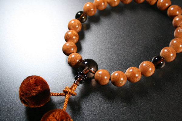 ◆男性用数珠◆永年保証付◆京念珠匠「琳」謹製【送料無料/レビュー5%OFF】「鳳眼菩提樹20玉茶水晶仕立:正絹凡天房」【桐箱入り】価格: 10,500円レビュー評価: 0.0 レビュー数:0 *この商品はご注文後生産品となります。お届けまでに 1週間から10日ほど要する場合がございます。【鳳眼菩提樹】お釈迦様が悟りを開かれた場所は菩提樹の木の下であったとして、仏教に縁の深い木である菩提樹の実です。まるで宇治の平等院の屋根の上にいる鳳凰の目を思わせる柄を持つ『鳳眼菩提樹』。切れ長の目じりや中心が目の玉のように見えます。この模様は人工的につけているのではなく、天然に実が持っている特徴で大変興味深く、珍しい菩提樹の実です。【茶水晶(スモーキークォーツ)】水晶の一種で、茶色や黒っぽい煙がかったような色をしたものを茶水晶と言います。古代より「悪霊を祓う守護石」として重用されてきた石です。その |